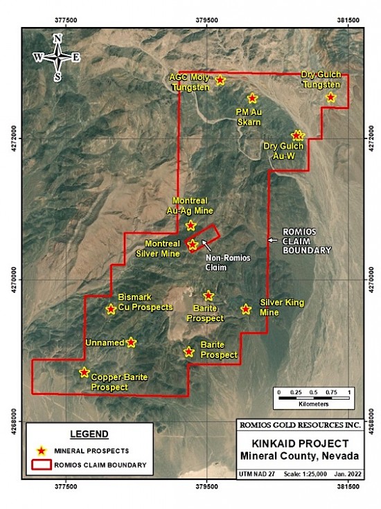 Toronto, Ontario – January 12, 2022: Romios Gold Resources Inc. (“Romios Gold” or the “Company”) (TSX.V-RG; OTCQB: RMIOF; Frankfurt: D4R) is pleased to report that it has acquired 109 claims over numerous historic gold-silver-copper prospects in the Kinkaid area of Mineral County, Nevada. The Kinkaid claims are 18 km east of the town of Hawthorne and largely accessible by road.