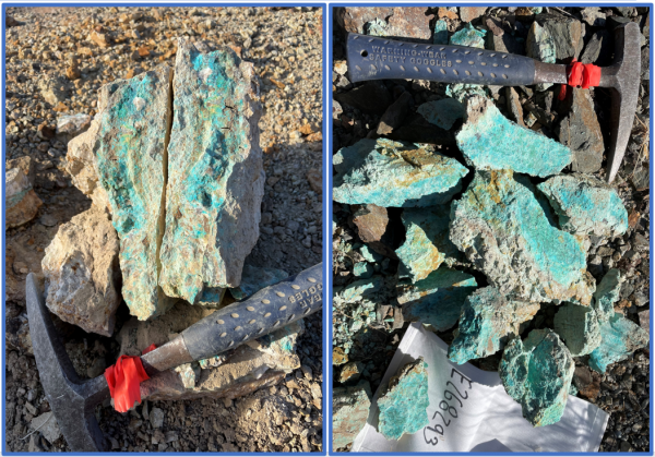 Photo 5 (left): Massive copper-rich barite zone. Photo 6: (right) Copper rich, chrysocolla stained boulders from unnamed prospect