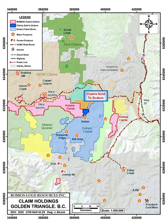 Toronto, Ontario – November 10th, 2025: Romios Gold Resources Inc. (“Romios Gold” or the “Company”) (TSXV: RG) (OTCID: RMIOF) (Frankfurt: D4R) is pleased to announce that is has sold a 100% interest in a 1,200 hectare claim package to Enduro Metals Corp. (“Enduro”) for $300,000 cash. Romios Gold retains a 2% net smelter returns royalty in the claims (the “2% NSR”). The three (3) claims (the “Royalty Property”) are located adjacent to Enduro’s ‘Andrei’ target on its Newmont Lake project (see Figure 1) and encompass a large magnetic high, part of a newly recognized trend of both magnetic and geochemical anomalies suggestive of porphyry copper-gold potential.