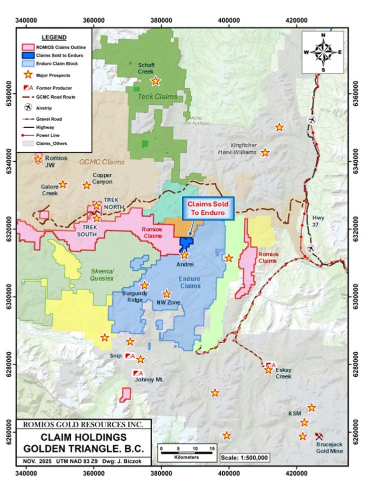Toronto, Ontario – November 10th, 2025: Romios Gold Resources Inc. (“Romios Gold” or the “Company”) (TSXV: RG) (OTCID: RMIOF) (Frankfurt: D4R) is pleased to announce that is has sold a 100% interest in a 1,200 hectare claim package to Enduro Metals Corp. (“Enduro”) for $300,000 cash. Romios Gold retains a 2% net smelter returns royalty in the claims (the “2% NSR”). The three (3) claims (the “Royalty Property”) are located adjacent to Enduro’s ‘Andrei’ target on its Newmont Lake project (see Figure 1) and encompass a large magnetic high, part of a newly recognized trend of both magnetic and geochemical anomalies suggestive of porphyry copper-gold potential.